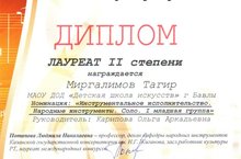 Диплом лауреата I степени – Гараев Ильяс (балалайка) преп. Филимонова А.И., конц. Хусаинова О.А.;