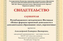 24 октября на базе ЦДОД "Заречье" Кировоского района г. Казани прошел методический фестиваль "Новые форматы проектной деятельности: опыт, перспетивы". В нем приняла участие заведующая организационно - массовым отделом Александрова Е.В.