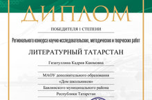 Методист МАОУ ДО "Дом школьников" Гизатуллина Кадрия Каюмовна приняла участие в Региональном конкурсе научно - исследовательских, методических и творческих работ "Литературный Татарстан", с работой "Литературный путеводитель Бавлинского района", где была награждена дипломом Победителя I степени.