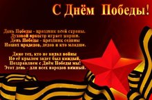 Уважаемые коллеги и родители, поздравляем вас с великим праздником, с Днём Победы. Пусть в нашей жизни всегда будет голубое чистое небо, пусть не узнают наши близкие и дети, что значит война, пусть наши сердца всегда гордятся подвигами наших дедов, пусть песня Победы в каждом из нас пробуждает силу патриотизма и чувства доброй надежды. -