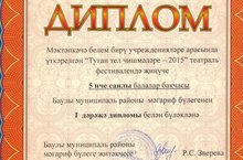 Бүген 9нчы санлы балалар бакчасында "Туган тел чишмәләре" театраль конкурсында катнашучыларны бүләкләделәр. Безнең балалар бакчасы 1 нче урынга лаек булды. "Иң якшы кечкенә актер" наминациясендә җиңүчеләргә грамоталар бирелде: Безенов Даниил, Киракосян Ашот, Таштимиров Ренат, Газимова Ильзира, Бирюкова Вика. Балаларга, тәрбиячеләргә, ата-аналарга зур рәхмәтебезне белдерәбез!