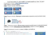 1 шаг. Войти в личный кабинет2 шаг. Открыть вкладку «Детские сады»3 шаг.Открыть вкладку «Проверить начисления и оплатить услуги детского сада»4 шаг. Появляется окошко «Начисления по родительской оплате и дополнительным услугам», в окошке «Муниципальное образование» выбрать из списка «Бавлинский район»5 шаг.В появившемся окошке из списка выбрать"Поповский детский сад"6 шаг. Ввести табельный индивидуальный номер ребенка7 шаг. Открывается окошко с оплатой нажать оплатить8 шаг. Открывается окошко «Информация о плательщике», все данные отмеченные красной звездочкой заполняем (ИНН, электронный адрес обязательно)9 шаг. Открывается окошко, где заполняются данные карты, с которой будет осуществляться оплата нажать оплатить10 шаг. Появляется квитанция, квитанцию можно распечатать, если имеется принтер. Если нет можно отправить на Ваш электронный адрес. Оплата прошла или нет указывается сразу в квитанции. -