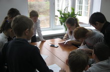 Учащиеся старших классов помогают малышам делать поделки для выставки.