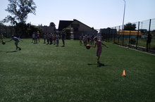 После утренней зарядки, дети соревновались на спортивной эстафете: бег со скакалкой, бег через обруч и ведение мяча одной рукой. После эстафеты ребята играли в футбол.