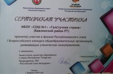 Ученическому самоуправлению «Галстучная страна» 1 февраля 2015г в г.Казани на финале Республиканского этапа 1 Всероссийского конкурса общеобразовательных организаций, развивающих ученическое самоуправление, вручили сертификат участника.