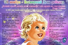 Сегодня , 20 ноября отмечается Всемирный день прав ребенка. В этот день в 1959 году Генеральной Ассамблеей ООН была принята Декларация прав ребенка, а в 1989 году - Конвенция о правах ребенка. Россия ратифицировала Конвенцию в 1990 году.