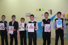 Агитбригада 5 Б класса провела внеклассное мероприятие для учеников 1-х классов. Они ознакомили первоклассников с правилами дорожного движения и провели викторину.