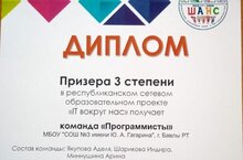 Учащиеся, 5 а класса Миннушина Арина, Шарипова Индира, Якупова Аделя, под руководством учителя информатики приняли участие в республиканском сетевом образовательном проекте и были удостоены Дипломом МО и Н РТ, 3 степени.