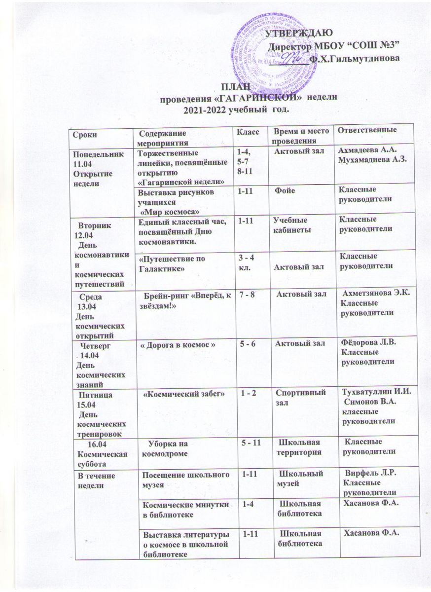 План Гагаринской недели./ Гагарин атналыгы планы. 08.04.2022