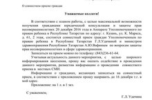 20 декабря 2016 года в Аппарате Уполномоченного по правам ребенка в Республике Татарстан по адресу: г.Казань,ул. К.Маркса, д.61, 2 этаж, состоится совместный прием граждан Уполномоченным по правам ребенка в Республике татарстан Г.Л.Удачиной и министом здравохранения Республики Татарстан А.Ю.Вафиным по вопросам защиты прав несовершеннолетних в сфере здравохранения. Записаться на прием можно по телефону: (843)236-61-64