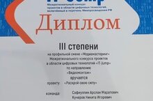 По итогам защиты проектов в Межрегиональном конкурсе проектов в области цифровых технологий «IT-Jump», учащиеся 6 а класса Сафиуллин Арслан и Кучеров Никита заняли 1 место и были внесены в Государственный информационный ресурс (ГИР), размещенный на сайте талантыроссии.рф.