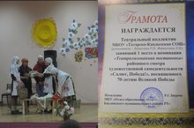 Бөек Җиңүнең 70 еллыгына багышлап районда сәнгать смотры үткәрелде. Безнең укучылар театр сәхнәләштереп 1 нче урынны яуладылар. Укучыларны һәм аларнын җитәкчесе Фатхуллина Л.М. ны котлыйбыз! Иҗади уңышлар телибез!