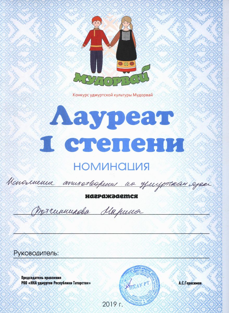 Победа воспитанника в конкурсе "МУДОРВАЙ" ("РОСТОЧЕК") в номинации "Стихотворение на удмуртском языке" 04.12.2019