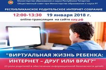 Республиканское родительское интернет-собрание 17.01.2018 19 января 2018 года в 12 часов состоится третье заседание Республиканского родительского интернет-собрания, посвященное вопросам информационной безопасности детей. Тема заседания – «Виртуальная жизнь ребенка: Интернет – друг или враг?»