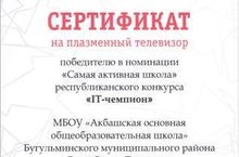 "Самая активная школа" 10.03.2016 Наша школа стала победителем в республиканском конкурсе"IT-чемпион" в номинации "Самая активная школа", получив в подарок плазменный телевизор.