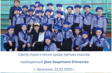 Впервые учащиеся педагога до " ТКД в начальных классах" Мустафиной Р.Г. приняли участие в смотре строя и песни, посвященном Дню Защитника Отечества,проводимом среди 3 классов школы.Смотр проходил 22 февраля. Её воспитанники, как и всегда, оказались на высоте.Заботливые родители сшили для них матросскую форму.По всем показателям конкурса, они заняли 1 место и получили кубок и Грамоту.