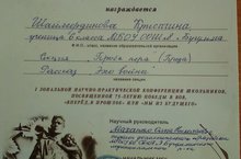 28 февраля 2020 года в г. Лениногорск в лицее №12 прошла 1 научно - практическая конференция школьников, посвященная 75 – летию Победы в ВОВ «Вперед, в прошлое» или «Мы из будущего». В конференции приняла участие ученица объединения « Краеведение» Шаймердинова Кристина, она получила Диплом участника, руководитель Маханько О.Н.