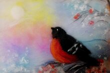 Девочки рисовали шерстью снегиря. Картины получились яркие, передающие всю красоту зимней природы. -
