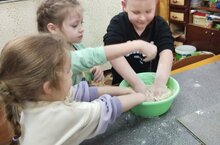 Дети сами изготовили тесто и делятся с вами его рецептом.1. Смешать в большой миске 2 части муки и 1 часть соли. Например, 1 стакан соли и 2 стакана муки.2. Постепенно добавить воду и аккуратно перемешивать массу пока консистенция не станет однородной.3. Перемешивать массу нужно примерно 5-10 минут, чтобы получить хорошо вымешанное и упругое тесто.Лепите с удовольствием!