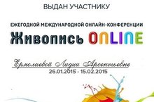 Сертификат выдан участнику Ермолаевой Лидии Арсентьевне за участия в ежегодной онлайн - конференции "Живопись - онлайн"