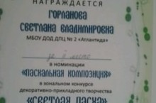 Награждается педагог дополнительного образования Горланова С.В. грамотой за второе место в конкурсе "Светлая Пасха"
