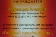 Награждается Муравцев Алексей за участие в муниципальном конкурсе "Главный праздник мая", руководитель студии "Волшебная шкатулка" Ермолаева Л.А.
