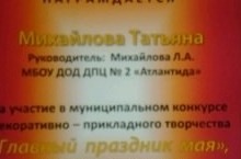 Награждается Михайлова Татьяна за участие в муниципальном конкурсе "Главный праздник мая", руководитель студии "Марионетки" Михайлова Л.А.