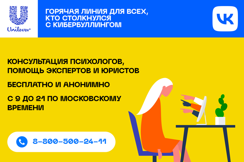 Позвонив на номер 8-800-500-24-11, вы получите консультацию психолога, контакты юристов и профильных некоммерческих организаций, которые смогут помочь вам или вашим близким. Проект создан Unilever и VK в рамках кампании #неткибербуллингу, которая объединяет всех, для кого насилие в сети и за её пределами – недопустимо.