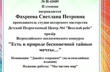Диплом Всероссийского экологического конкурса "Есть в природе бесконечной тайные мечты" конкурса 30.12.2020