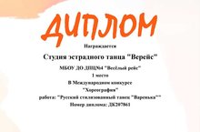 Студия эстрадного танца "ВЕРЕЙС" Диплом 1 место международный конкурс хореография. 27.01.2021