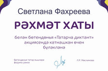 Диплом за участие педагога Фахреевой Светланы в Республиканской акции "Татарский диктант". Результат-отлично! 16.11.2020