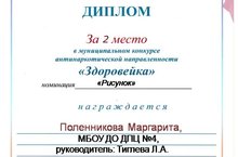 Диплом за II место в муниципальном конкурсе "Здоровейка" антинаркотической направленности в номинации "Рисунок" 16.11.2020