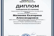 Диплом победителя 2 степени Тотального тестирования - педагог Матвеева Екатерина Александровна 12.09.2016