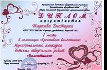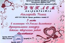 Поздравляем Асылгарееву Регина с 3 местом в муниципальном конкурсе детских творческих работ "Валентинка". Педагог Аметова В.Р.