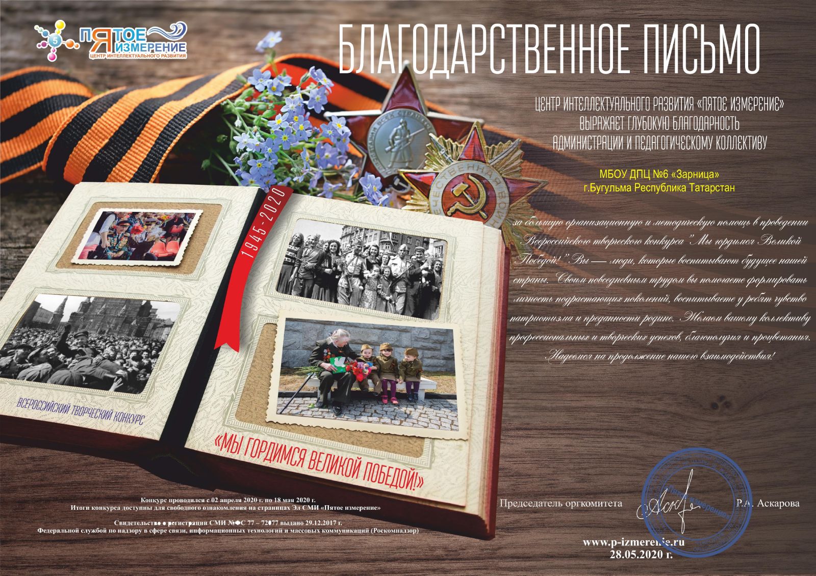 Муниципальное бюджетное образовательное учреждение дополнительного образования детский (подростковый) центр №6 "Зарница" Бугульминского муниципального района Республики Татарстан / Татарстан Республикасы Бөгелмә муниципаль районы бюджет өстәмә белем бирү муниципаль учреждениесе «Зарница» 6нчы балалар (яшүсмерләр) үзәге