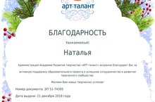 Благодарность за активную поддержку образовательного проекта. 21.12.2018