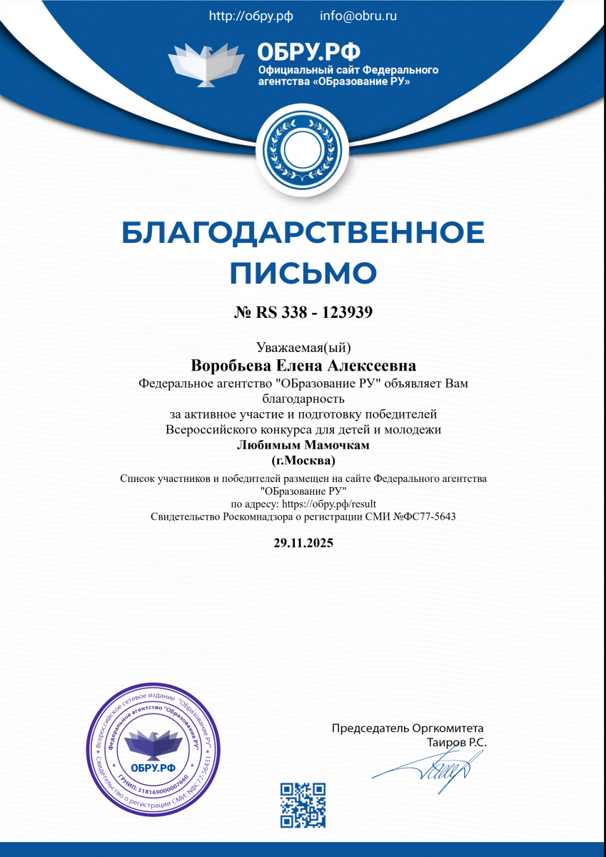Диплом 1 место Воробьева Елена Алексеевна, Всероссийский