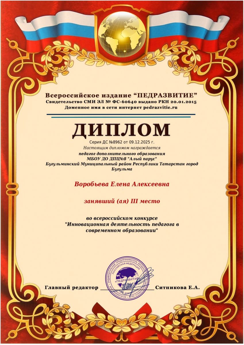 Диплом 3 место Воробьева Елена Алексеевна, Всероссийский