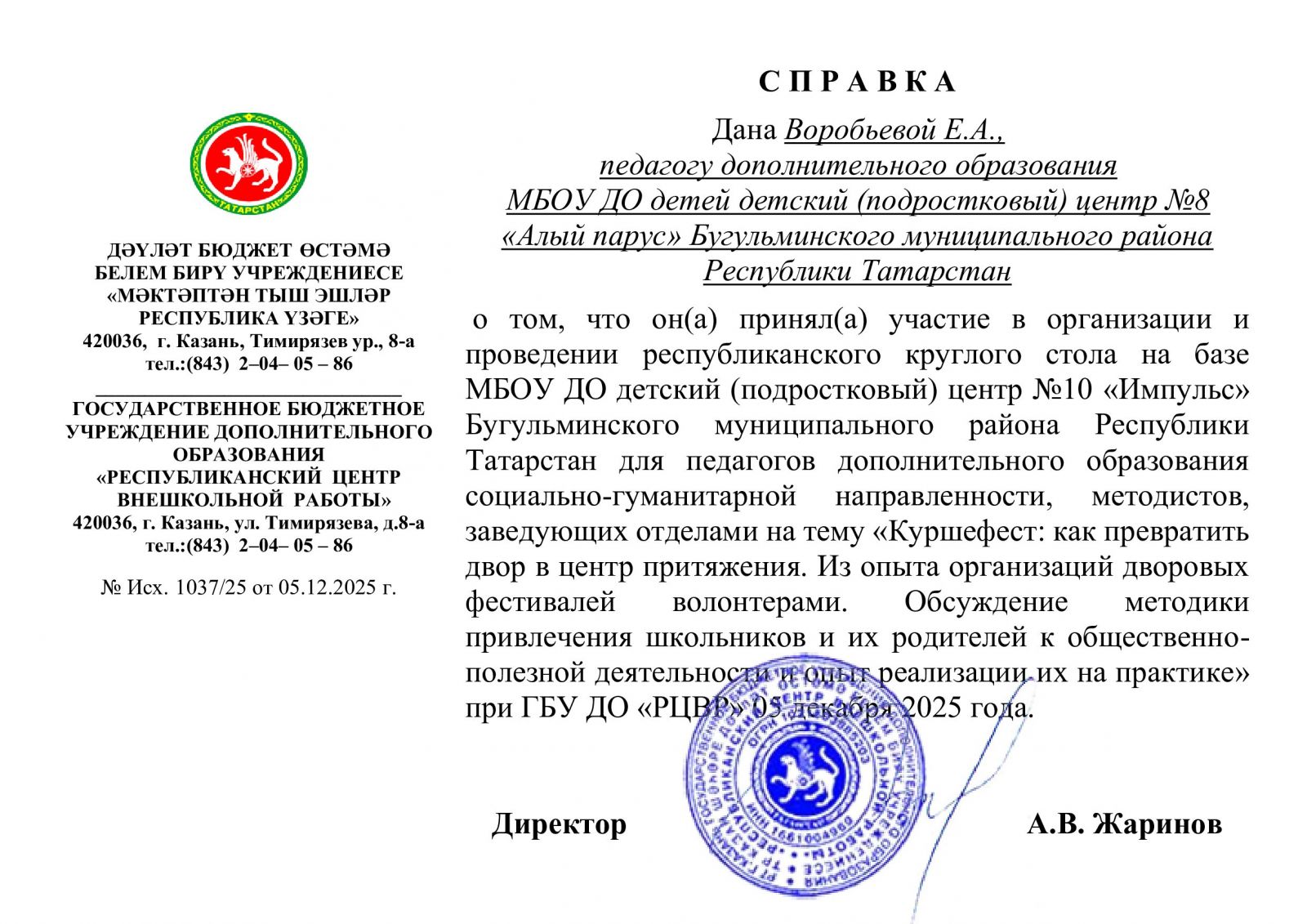 Воробьева Е.А. справка об участи в республиканском круглом столе