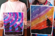 Учимся изображать космическое небо, передавая в рисунке ночь и тени деревьев.