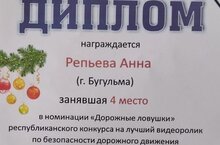 Поздравляем воспитателя старшей - подготовительной группы Репьёву Анну Николаевну с получением диплома и сертификатов за 4 место в республиканском конкурсе видеороликов по безопасности дорожного движения.