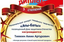 Поздравляем Тимкина Амина с победой в региональном конкурсе семейного творчества «Аты-Баты», посвященного Дню защитника Отечества