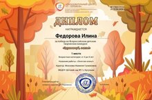 За победу во Всероссийском творческом конкурсе "Здравствуй, Осень!" наша воспитанница средней группы Федорова Илина заняла 1 место. Куратор: воспитатель Моисеева Фазиля Гусмановна. Поздравляем!!! Желаем дальнейших побед!!!