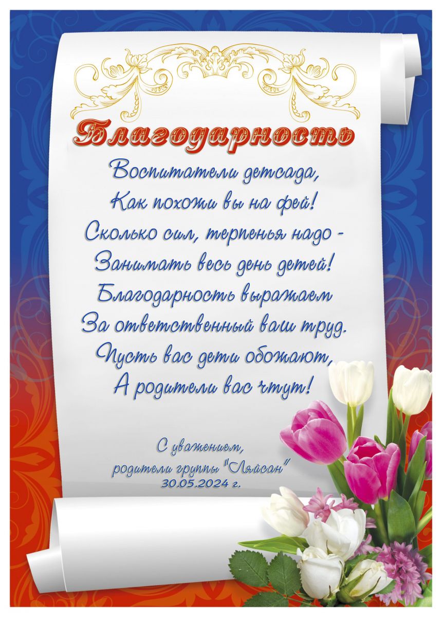 Коллектив родителей и детей татарской группы «Ляйсан» выражает искреннюю благодарность нашим уважаемым воспитателям Зухре Галимовне и Лейсан Сиреньевне за профессионализм, целеустремлённость, ответственное отношение к своей работе и педагогический талант.