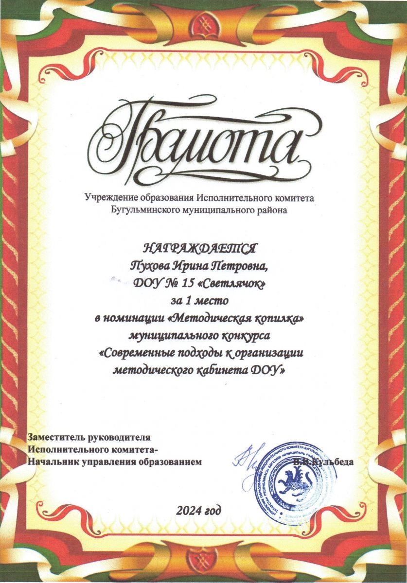 Старший воспитатель Пухова Ирина Петровна награждена грамотой Управления Образования Исполнительного комитета Бугульминского муниципального района за 1 место в номинации «Методическая копилка» в муниципальном конкурсе «Современные подходы к организации методического кабинета в ДОУ» в рамках районного методического объединения старших воспитателей.