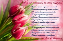 Милые женщины! От всей души поздравляем вас с праздником, с Международным женским днём! Пусть Весна вас радует, вдохновляет, наполняет энергией! Любви и счастья вам! Мира и тепла вашим семьям!