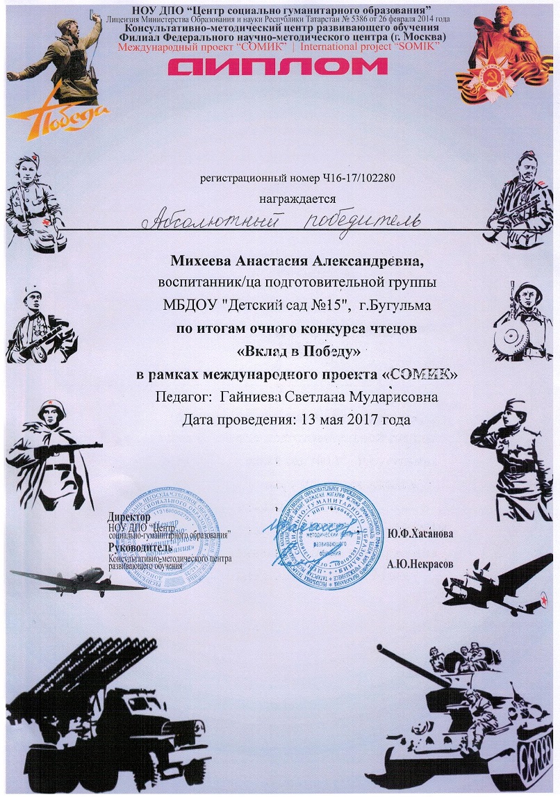 Опубликовано: 13.05.2017Михеева Анастасия, воспитанница подготовительной группы «Звёздочки», по итогам очного конкурса чтецов в номинации «Вклад в Победу» в рамках международного проекта «Сомик» стала абсолютной победительницей.