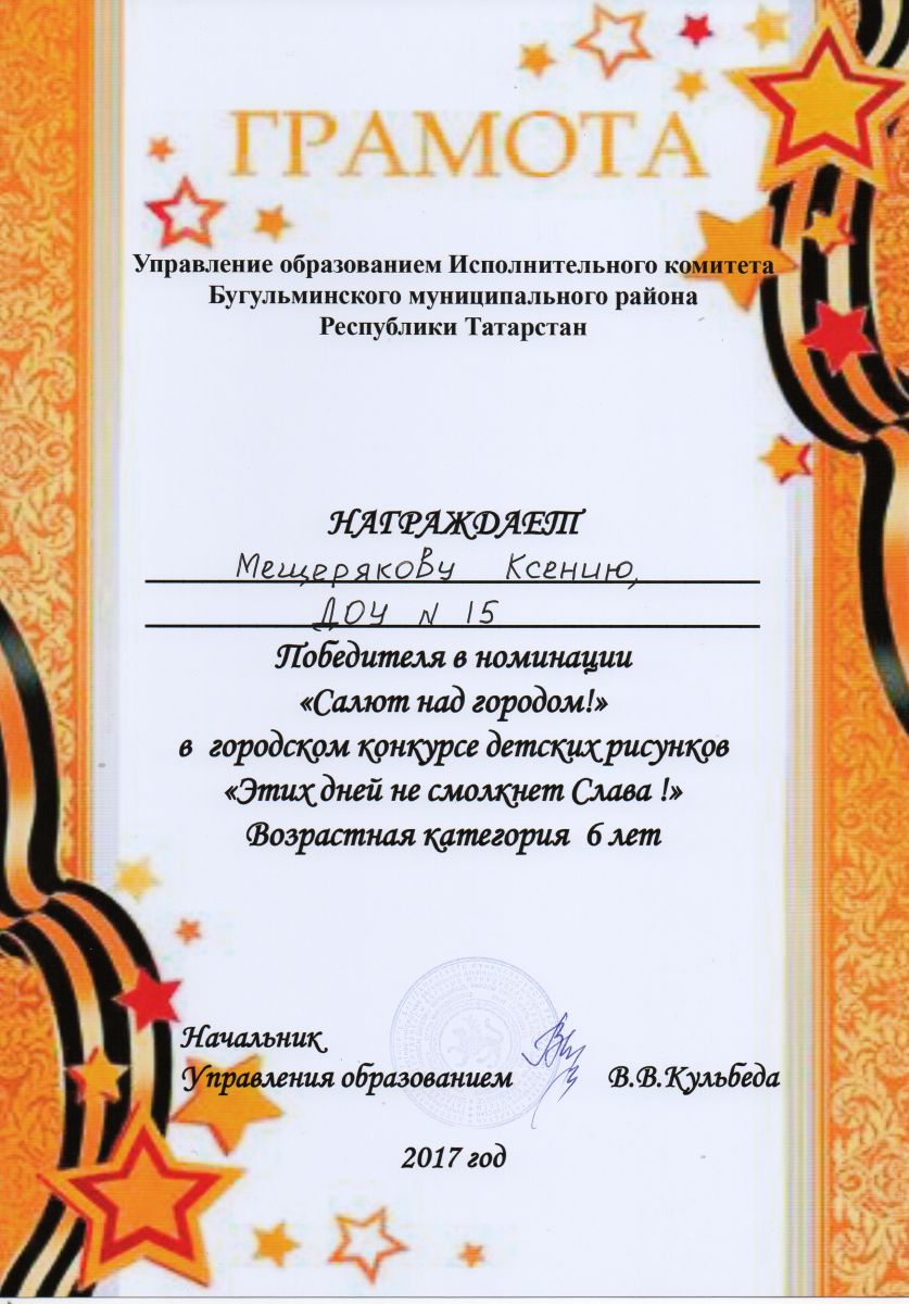 Победителем в номинации «Салют над городом» стала воспитанница старшей группы "Ягодка" Мещерякова Ксения (воспитатели: Возная Н.А., Мурунова А.В.)