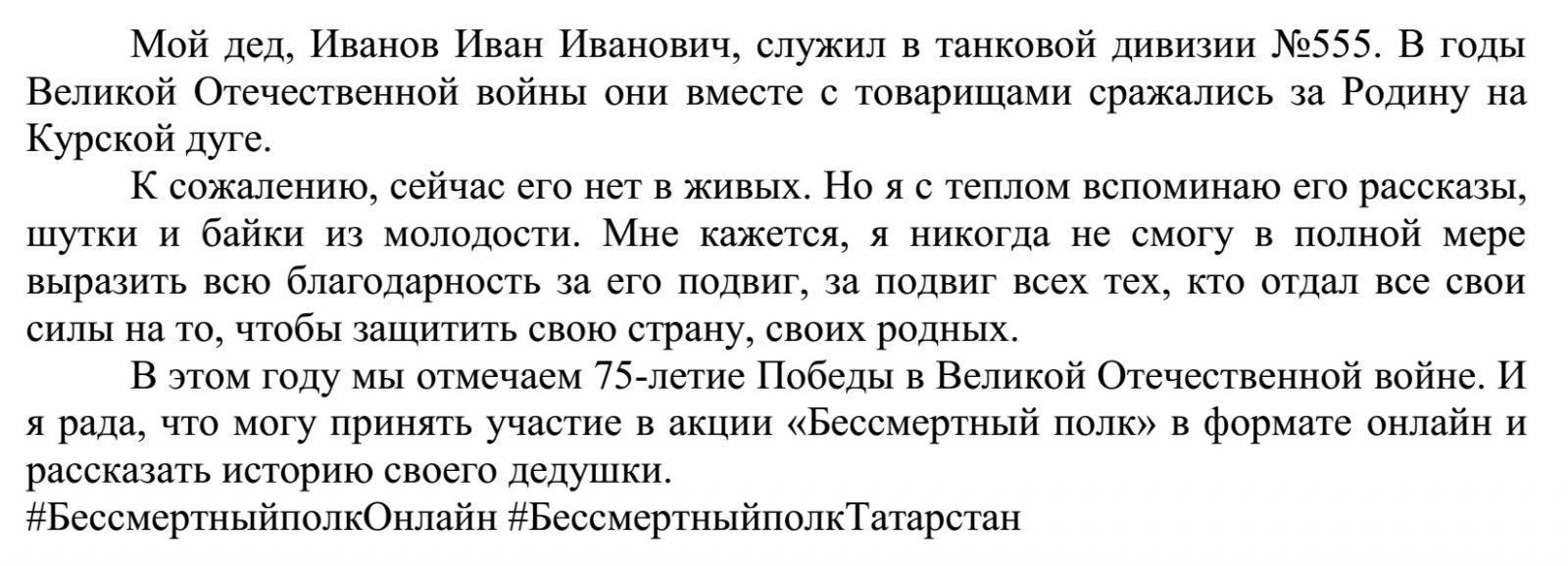 Упоминание об участии в акции «Бессмертный полк в Татарстане Онлайн»