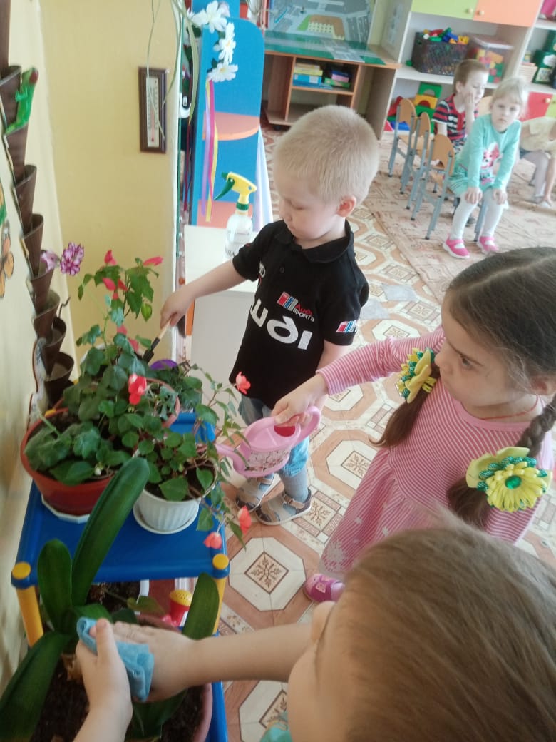 Дети в игровой форме трудились в уголке природы. Поливали, рыхлили, протирали листья растений, которые находятся в группе.